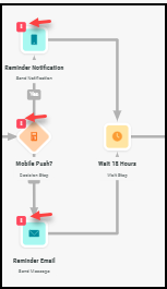 Within the Journey canvas, any steps that require additional configuration are marked with a red exclamation mark. You can click on the Step to open the Settings pane to see the pending updates.