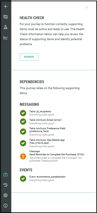 To see your Journey's Health Check, click on the first aid box icon in the left side menu.