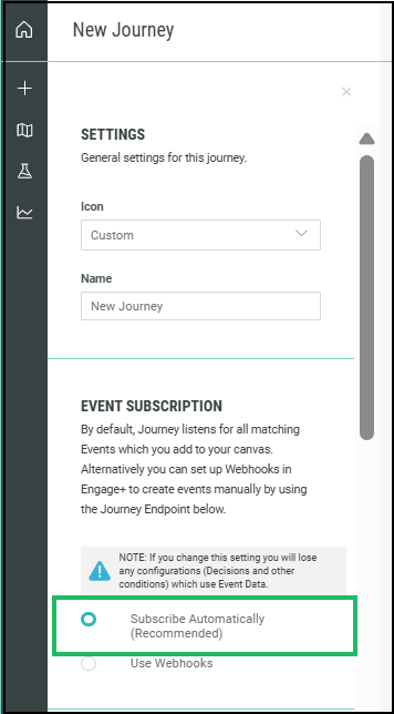 Note: When configuring your Journey Settings, you can have your Event Subscriptions set to either Subscribe Automatically or Use Webhooks. Based on this selection, the method for selecting your events in the Step will differ. Refer to Journey Settings for more details.