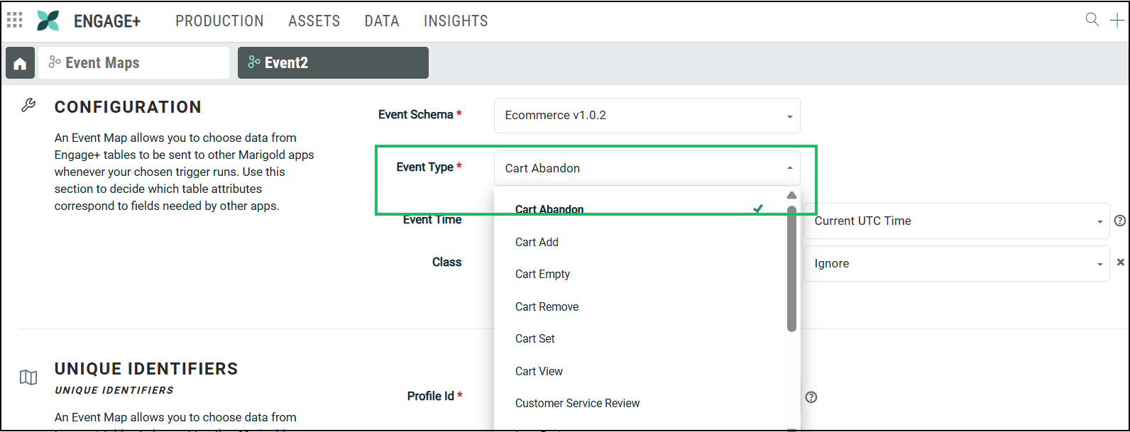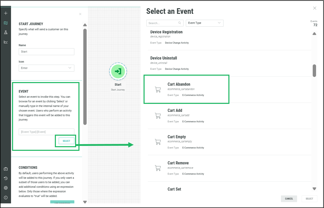For example, to use the Cart Abandon event in the Start step of an Abandoned Cart Journey, you must have an Event Map created with the Event Type: Cart Abandon.