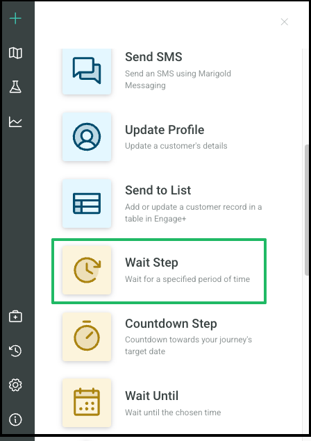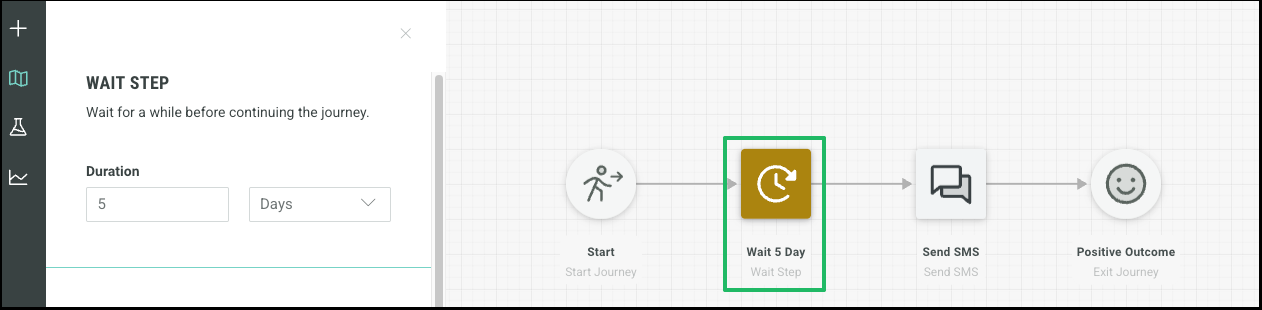 Wait Steps are used to manage the cadence of your Journey. They hold the customer at that point of the Journey for a defined period before proceeding to the next step, such as waiting a week before sending a reminder message.