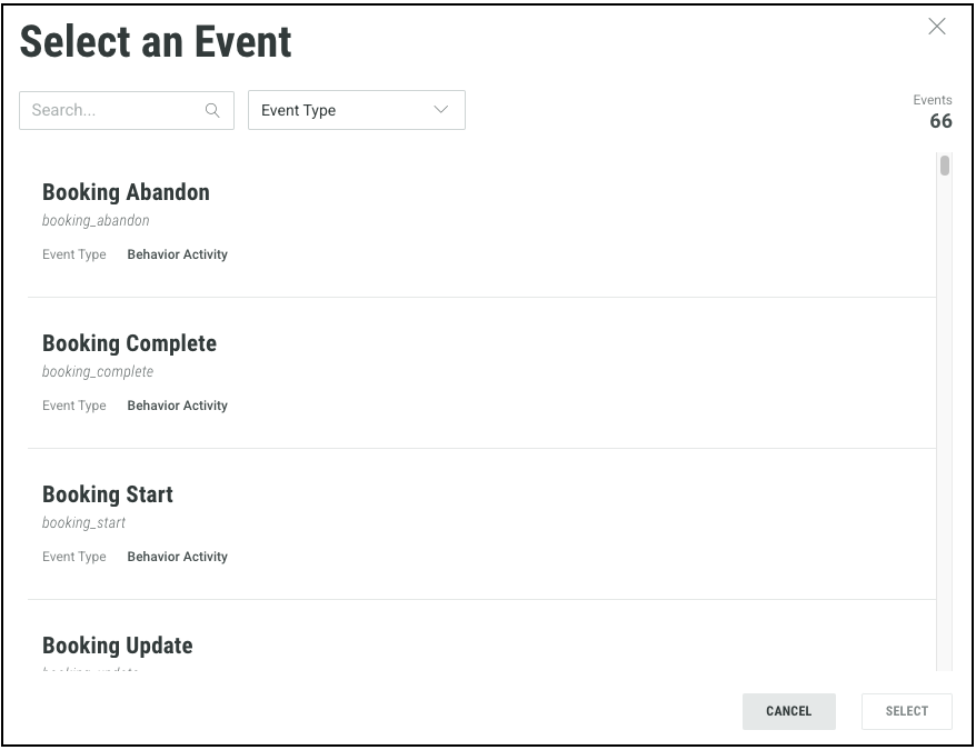 Alternatively, you can use the Event Type to filter the events. An Event Typerepresents a group of similar events. Most of the events that can be used in your Journey Steps are available in these Event Types: E-Commerce Activity, Campaign Activity and Profile Sync Activity.