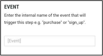In this field, you can define which customer event will trigger this Step. Customers will move through this Step in the Journey as they perform the event related action in real-time, such as making a purchase or signing up.