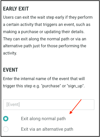 By default, the wait step is set to “Exit along normal path”, meaning the Journey will continue as usual after the wait. If you want the step to be exited before the set duration, select “Exit via an alternate path”. You can create an alternative exit path by drawing a second exit from the wait step.