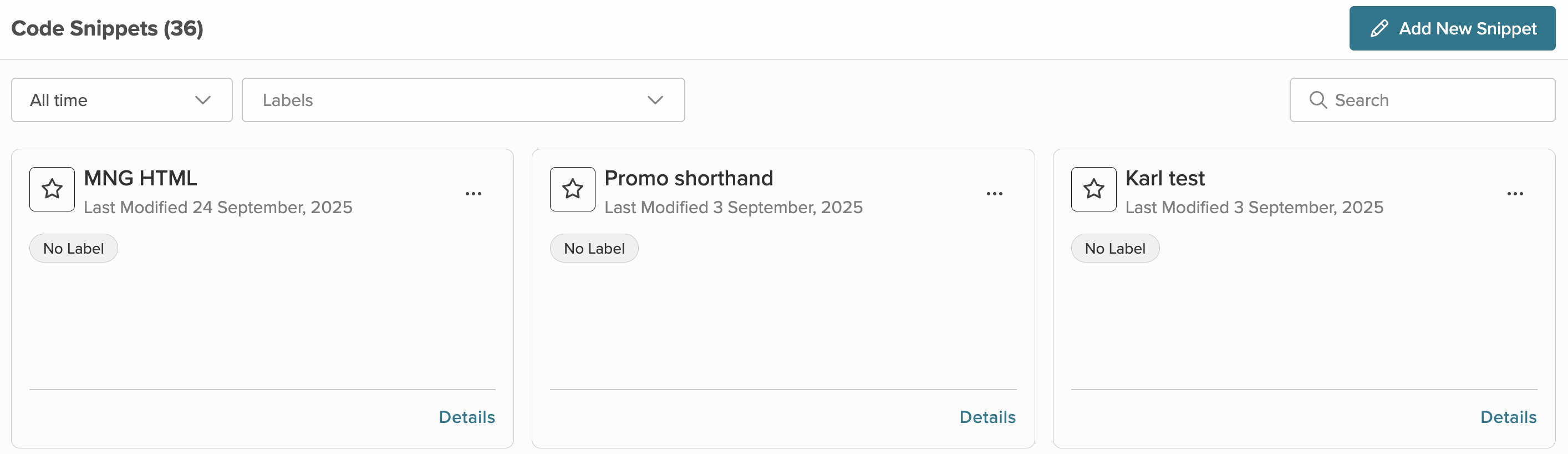 We’re introducing Code Snippets; a brand new UI and centralized way to create and manage Includes (including Zephyr snippets). The new Code Snippets page replaces the Includes page in Sailthru