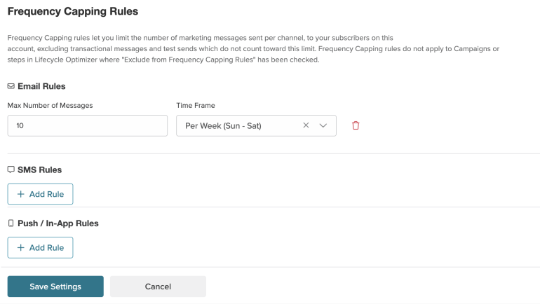 Selecting this rule limits the number of marketing messages you can send to a subscriber each week. A week runs from 12AM on Sunday to 11:59PM on Saturday based on your account's time zone.