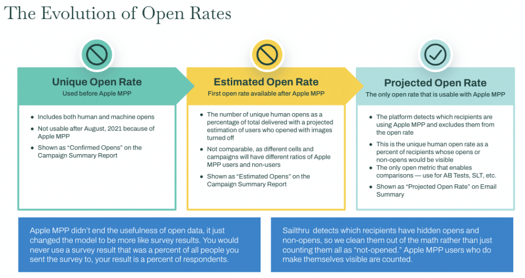 With the implementation of Apple MPP in September 2021, it has forced marketers to rethink how email marketing metrics are measured. This guide describes the impacts of Apple Mail Privacy (MPP) on marketers and explains the solutions provided by Sailthru.Summary of Open Metrics