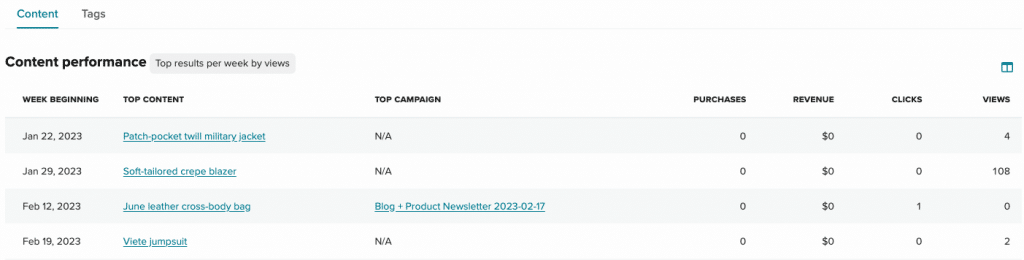 Understand how your customers engage with your content and tags over time with Content Summary. Located in the Analytics menu under Summary, this report will give you visibility into trends relating to your content engagement by comparing views, clicks, revenue, and purchases year-over-year.