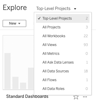 - From the Explore view, select an available Project. Once a project loads, select a dashboard. For the following examples, we'll look at the Executive Dashboard available in the Standard Dashboards project.