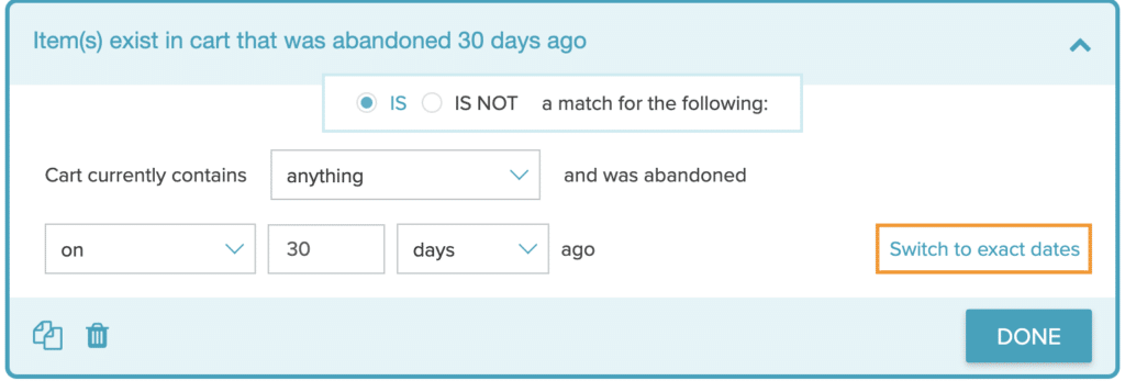 This filter matches users who abandoned a cart at one point or after your selected number of days, weeks, months, or years ago.