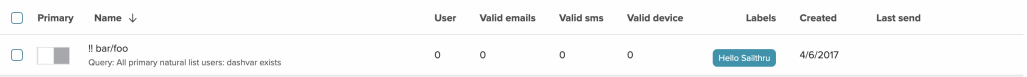 Select the column headers to sort by list name, the number of users, valid emails, valid sms numbers, valid devices, created date, or last used date. The Primary and Labels columns are not sortable.
