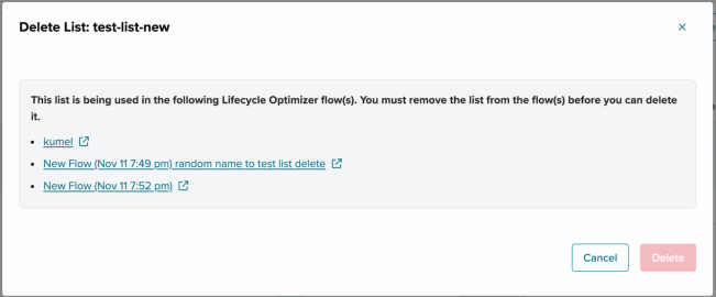 • Delete a single list used in Lifecycle Optimizer: