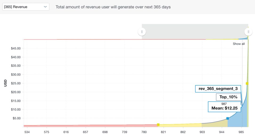 • Graph – The prediction selected in the drop-down is graphed across your userbase. The color coding indicates the ranges for which we have automatically identified a distinct segment for this prediction, though you can also create your own custom segments, using the data on the graph as a reference. The details of each segment are shown in the table below.