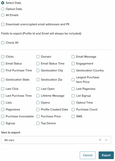 In My Sailthru, you can download a CSV file of user data for any list. You can select which fields and vars to export, or choose to export only email addresses or opt-out data.