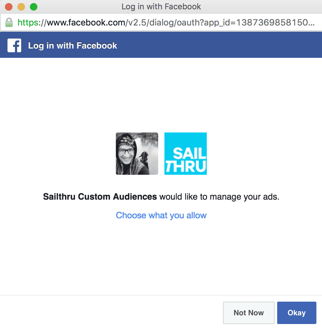 The first time you export a list, a popup window is triggered. You are asked to give the Custom Audiences app permissions to access your public profile and manage your ads. This step is required to be able to push user data into your account. Click Okay.