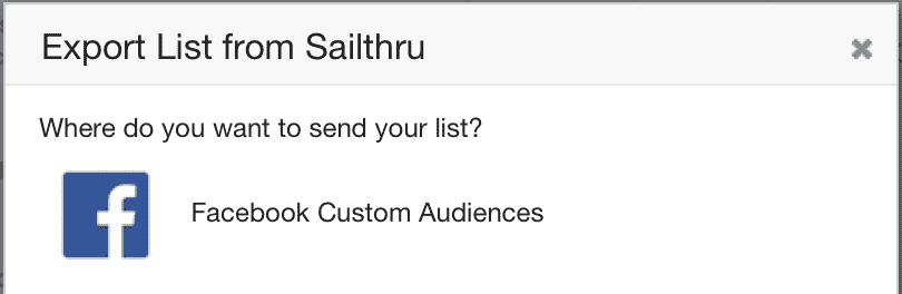 Step 2: With a custom script, push this list automatically to Facebook, making sure that your vars match Facebook's. This is the step that won't be scaleable on Sailthru's side as that exists as the same code for all customers and not everyone will use the same custom variable names.