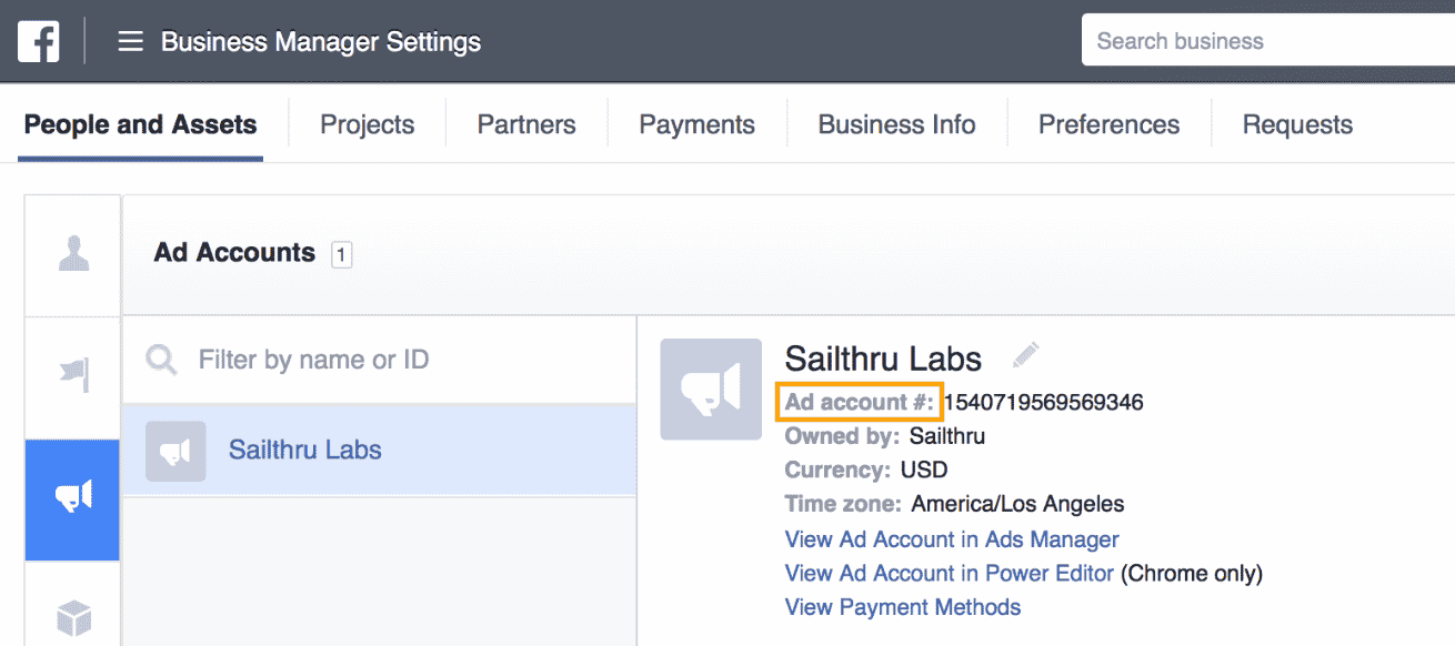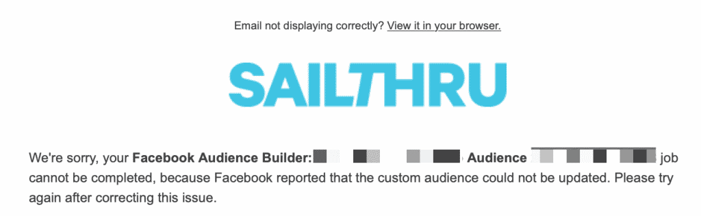 • The Ad Account ID has changed and your account does not have access to the Account ID. The Sailthru <> Facebook Custom Audiences connection that you set up is still tied to the old Account ID.