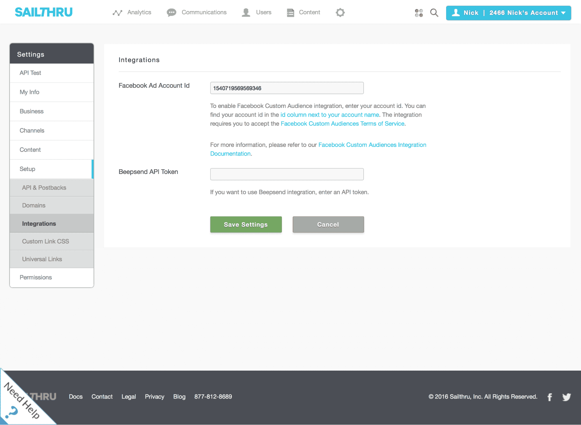 In the UI, go to the Settings page, and under Setup, select Integrations. Paste the Ad Account number into the Facebook Ad Account Id box.