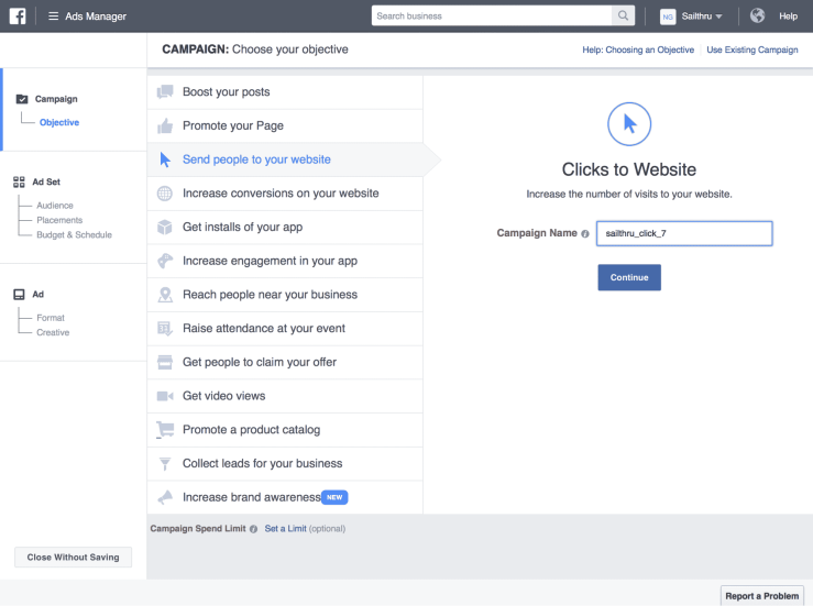 Create an ad with a campaign that matches the original segment that you exported. This will allow you to track success of the exported audiences in your own reporting. For example the, ad below uses a campaign name of sailthru_click_7. The goal of this campaign would be to find lookalikes of customers that are predicted to click in an email campaign in the next 7 days. If you are using other audiences, identify them in the same manner.