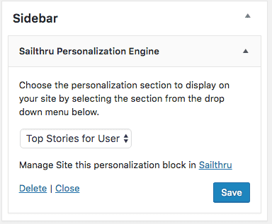 This widget gives you the option to render a Site REcommendations section directly on your page, combining the power of Sailthru's personalization and WordPress's drag and drop interface.