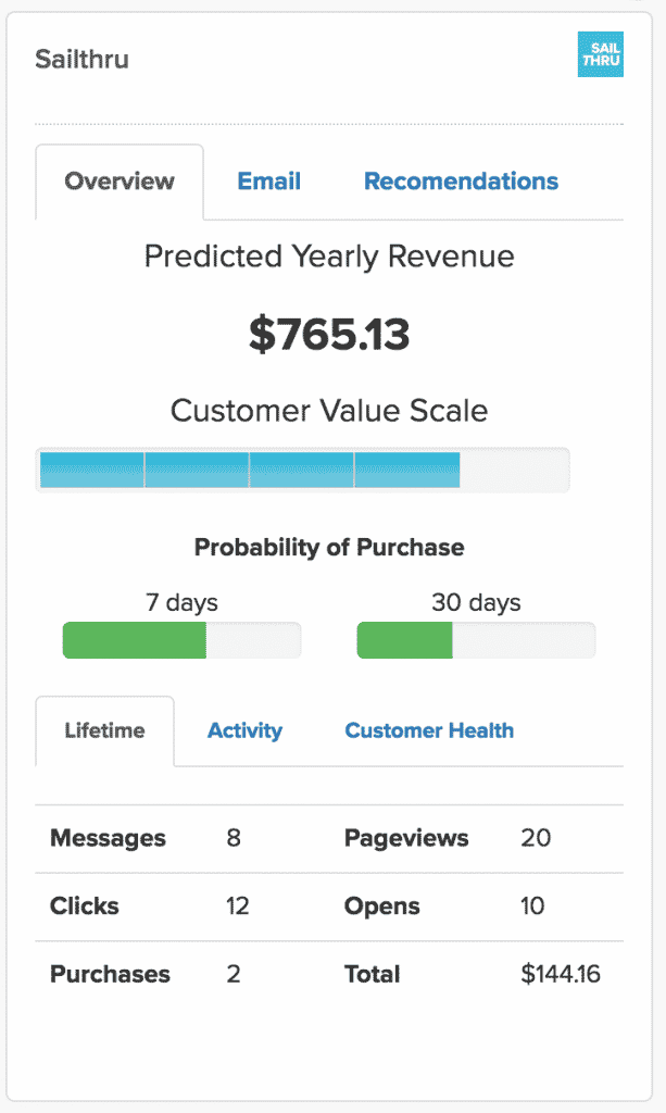 The Overview page shows predictive stats at-a-glance, as well as stats about lifetime interaction, activity highlights (sign-up date, most recent pageview, open, click, and more), and allows you to set Customer Health as a var.