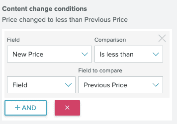 - Set the Content change conditions. Your conditions can be as simple or as complex as you need them to be. For a Price Drop trigger, use these settings: