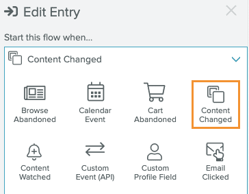 The Content Changed entry in Lifecycle Optimizer initiates a flow when the content for an item reflects the conditions you set.