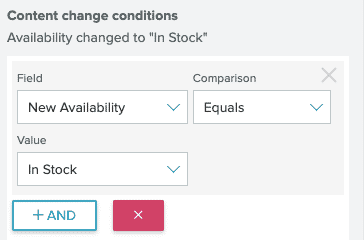 - Set the Content change conditions. Your conditions can be as simple or as complex as you need them to be. For a Back in Stock trigger, use these settings: