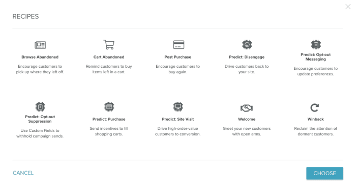 | Predict: Opt-out Suppression | Use custom fields to withhold messaging from users with the Predict: Opt-Out Suppressions recipe. |