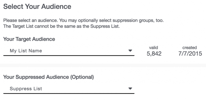 In this section, you will choose the audience for your email by setting a target list, and, optionally, a suppression list-users who should be excluded from the send. If you need to use multiple suppression lists, please reach out to your Customer Success Manager to enable this capability. (To read more about how to create, manage, grow, and track lists, see the Lists Creation section of the Audience Overviewdocumentation pages.)