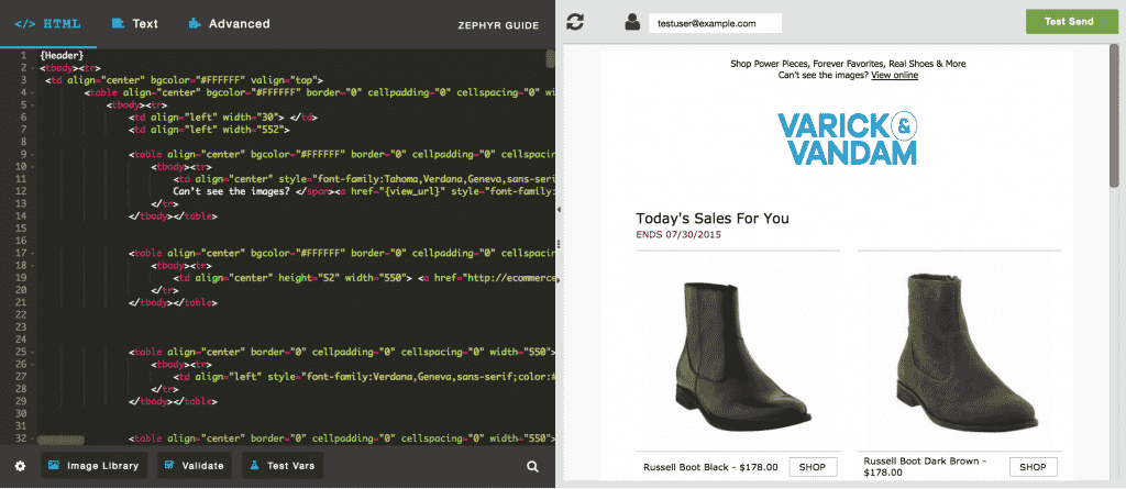 See the For Developers documentations pages for more information on using Zephyr for email campaigns. You can also click Zephyr Guidefrom the Design page in the platform (next to the Advanced tab) to access the Zephyr Syntax Overview documentation.