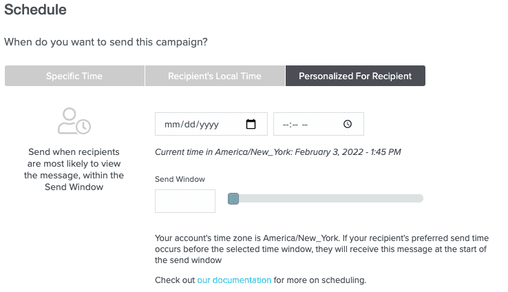 On the Schedulepage, set up all options around how and when your email will be sent.There are three options available for scheduling your campaign send: Specific Time, Recipient's Local Time, and Personalized for Recipient.