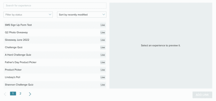 When you select one from the list, you'll see it in the Preview window. The preview also gives you the URL and shows when the experience was last updated.