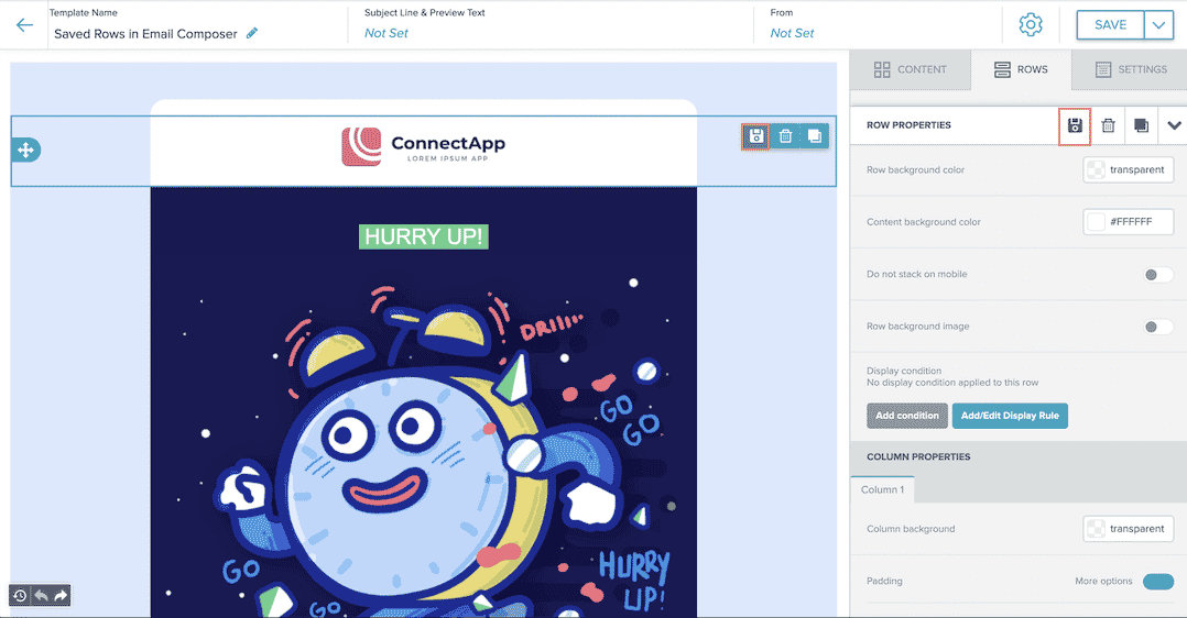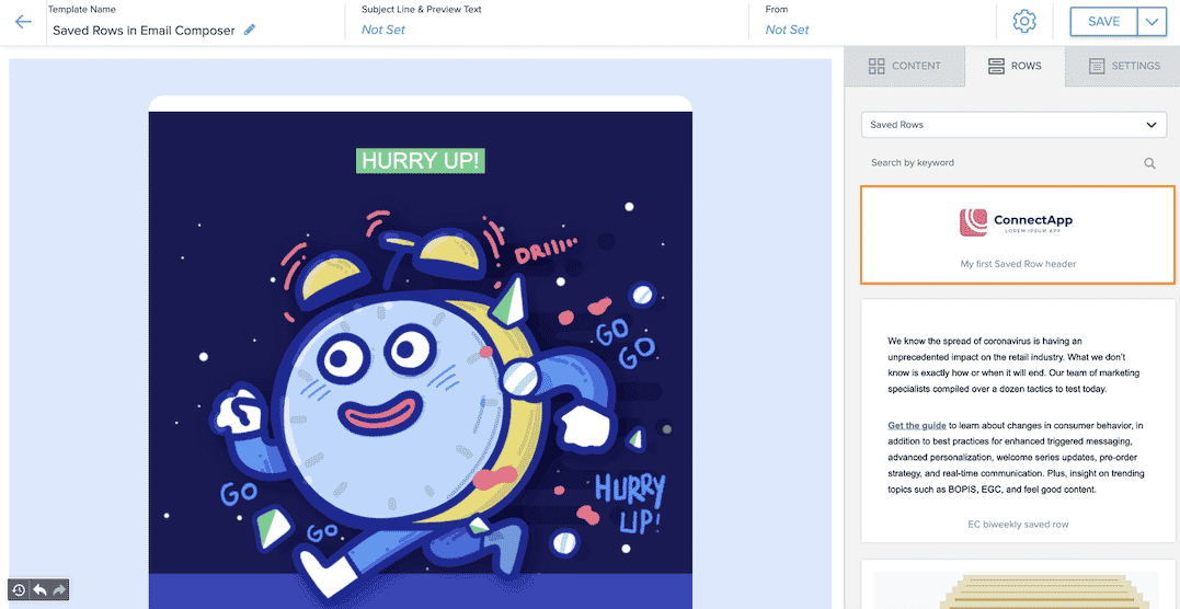 Saved rows help you streamline your template creation process. Create a universal header or footer once and use it across all your email messaging. Either process - saving or using a saved row - requires only a few steps to complete.