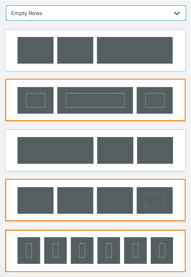 Create custom-sized columns for your templates. Three of the pre-built column structures allow for customizing the columns. From the Rows tab, under Empty Rows, look for the column structures that contain dashed boxes. They're outlined in orange in the following image: