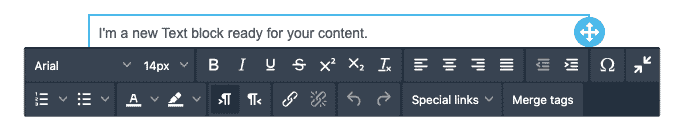 To add text to an email, select the content tab and drag the Text content block into a structure. You will see the following text appear. "I'm a new Text block ready for your content." Click anywhere on that sentence to edit the text (you can triple-click the text to highlight and replace it). A number of text formatting tools is displayed: