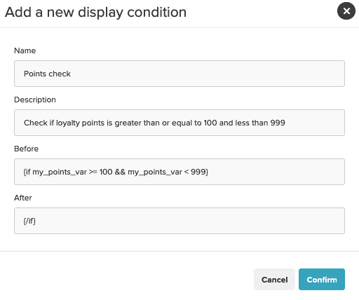 - Add the opening conditional logic in the Before field. This usually starts with {if...}