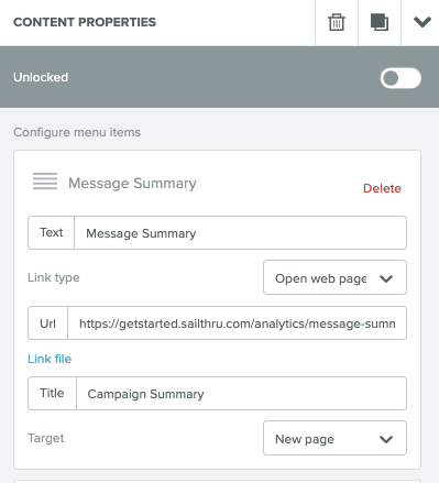 - Add and configure menu items; set the appearance properties for the menu; set options for the whole block; and choose whether or not this is a mobile menu from the Content Properties tab.