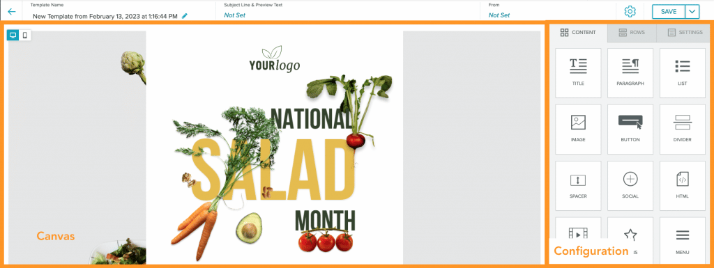 Email creation and editing is divided into two main areas. The Canvas, where you drag and drop content and structural elements, and the Configuration panel where the drag-and-drop options and their properties live.
