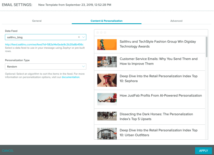 Easily select a Data Feed and apply a Personalization Type in the Content & Personalization tab: