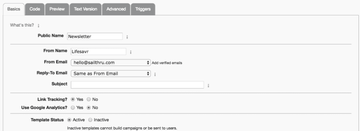 - In the Template Editor, use the tabs described below - Basics, Code, Preview, Text Version, Advanced, and Trigger - to enter all template settings and code.