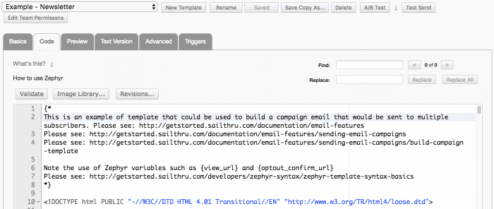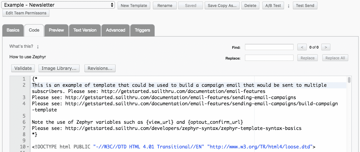On the Code tab, write (or paste) and edit the HTML, CSS, and Zephyr code that will be used when generating the email body. The HTML and CSS will provide the design (and any hard-coded content) and the Zephyr code will handle the display of dynamic content, such as content from a data feed. For more information, see the For Developers documentation.