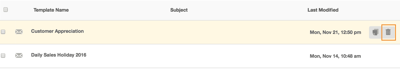 To copy a Template, hover over the chosen Template and select the copy icon on the right. Next to Copy you'll also find the option to delete your Template.