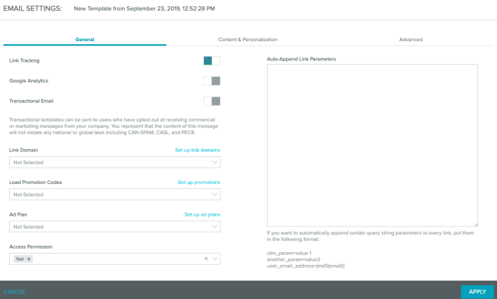 2. In the General tab on the Settings Editor, locate Transactional Email.