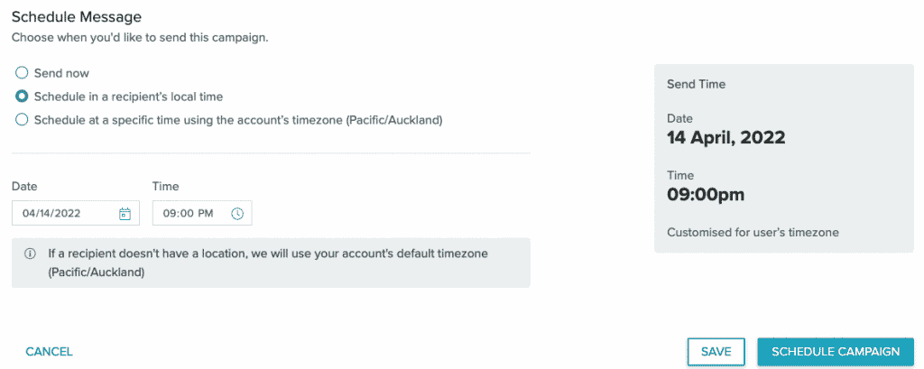 - Select Schedule Campaign send immediately or schedule your message.