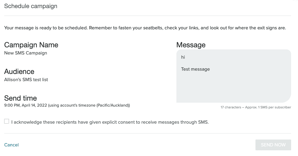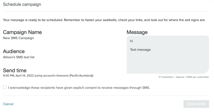 Check that the information in the Schedule campaign modal is correct and select the checkbox to acknowledge that all recipients have given explicit consent. Once you select the checkbox, the Send Now button turns blue. Select the button to send your message.