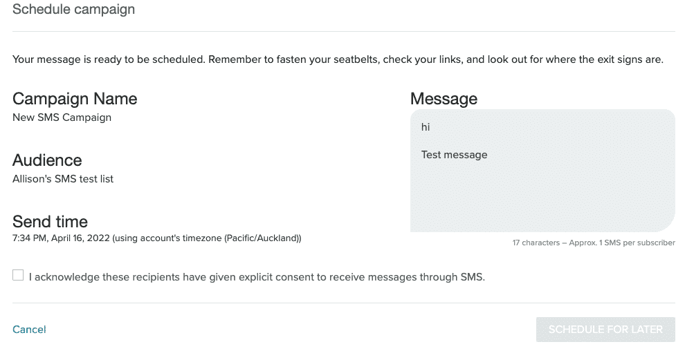 Check that the information in the Schedule campaign modal is correct and select the checkbox to acknowledge that all recipients have given explicit consent. Once you select the checkbox, the Schedule For Later button turns blue. Select the button to schedule your message.