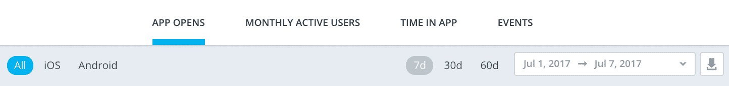 The App Opens tab shows the frequency with which your users are opening your app. An open is recorded each time a user opens your app, so an individual user many be responsible for many opens across any given time period. Opens is a key metric for success in determining the extent to which your audience is using the app.