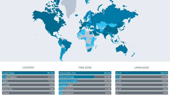 The Geography interface allows you to view the geographic locations of your audience. The lists at the bottom of the page showcase the top languages, countries, and time zones of your users. Marketers can use this information to ensure that apps and messages are relevant to the language and location of their audience.