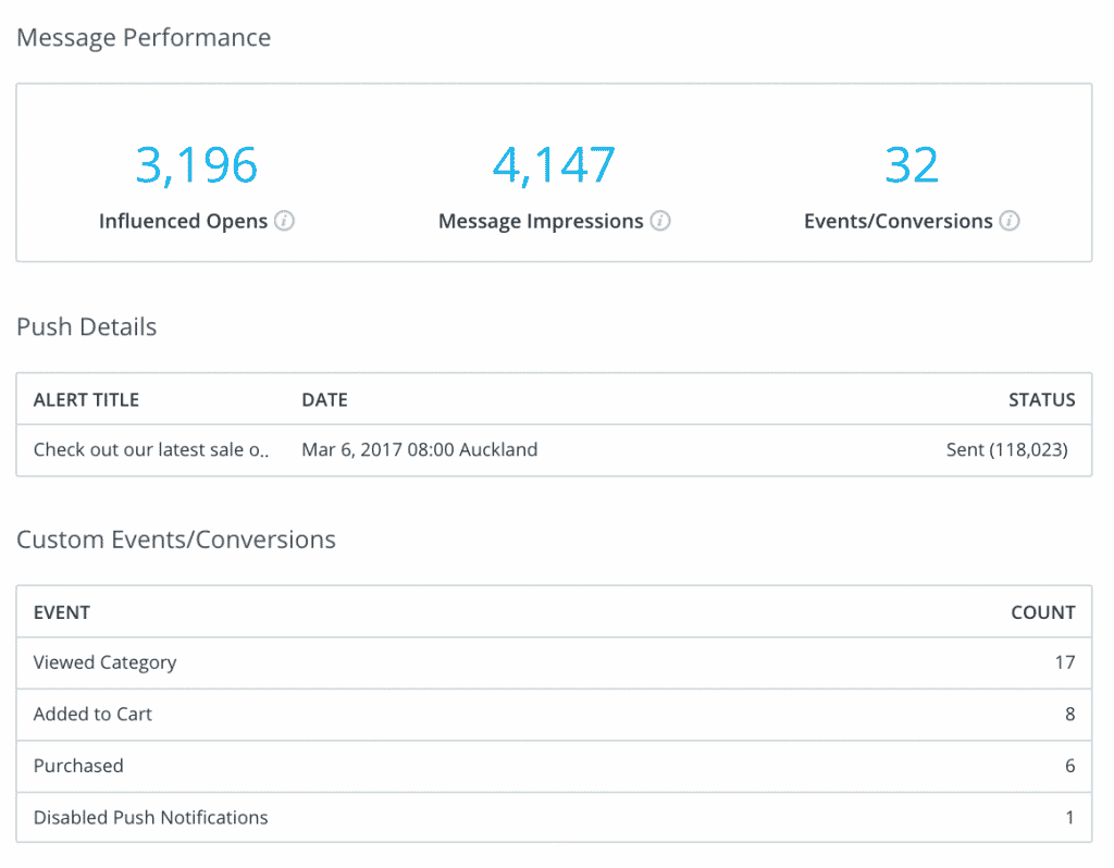 All events and influenced opens are measured with a 'Last Push Win' attribution model. This allows you to measure the effectiveness of the most recent notification touchpoint people interact with.